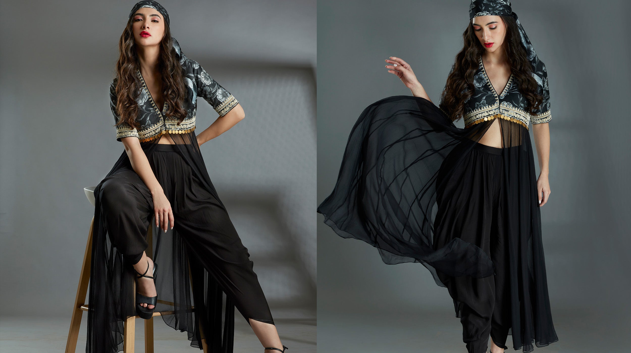 Black Custom Floral Print, Flowing Chiffon, Embroidered tunic with Dhoti Pants